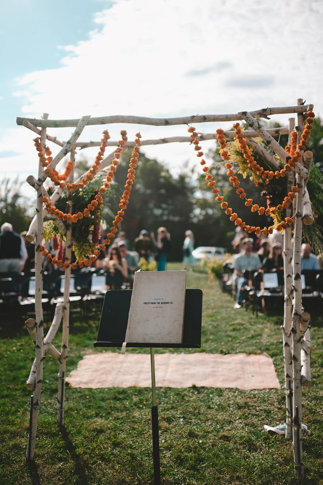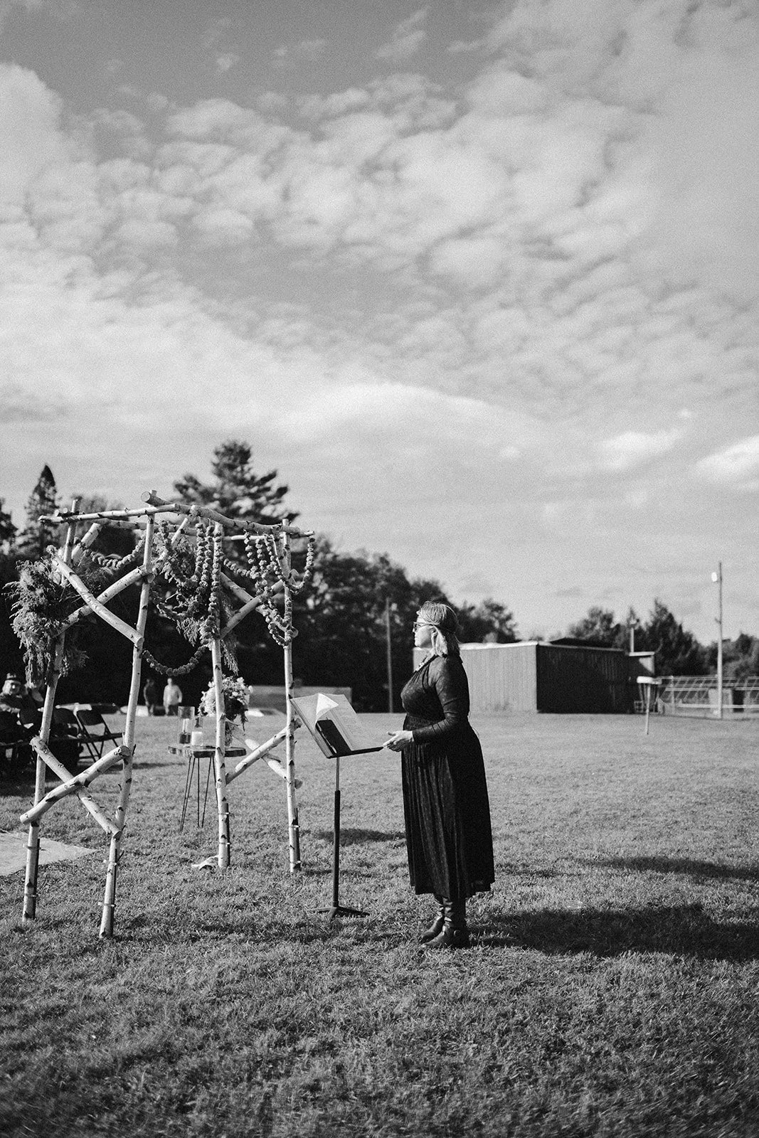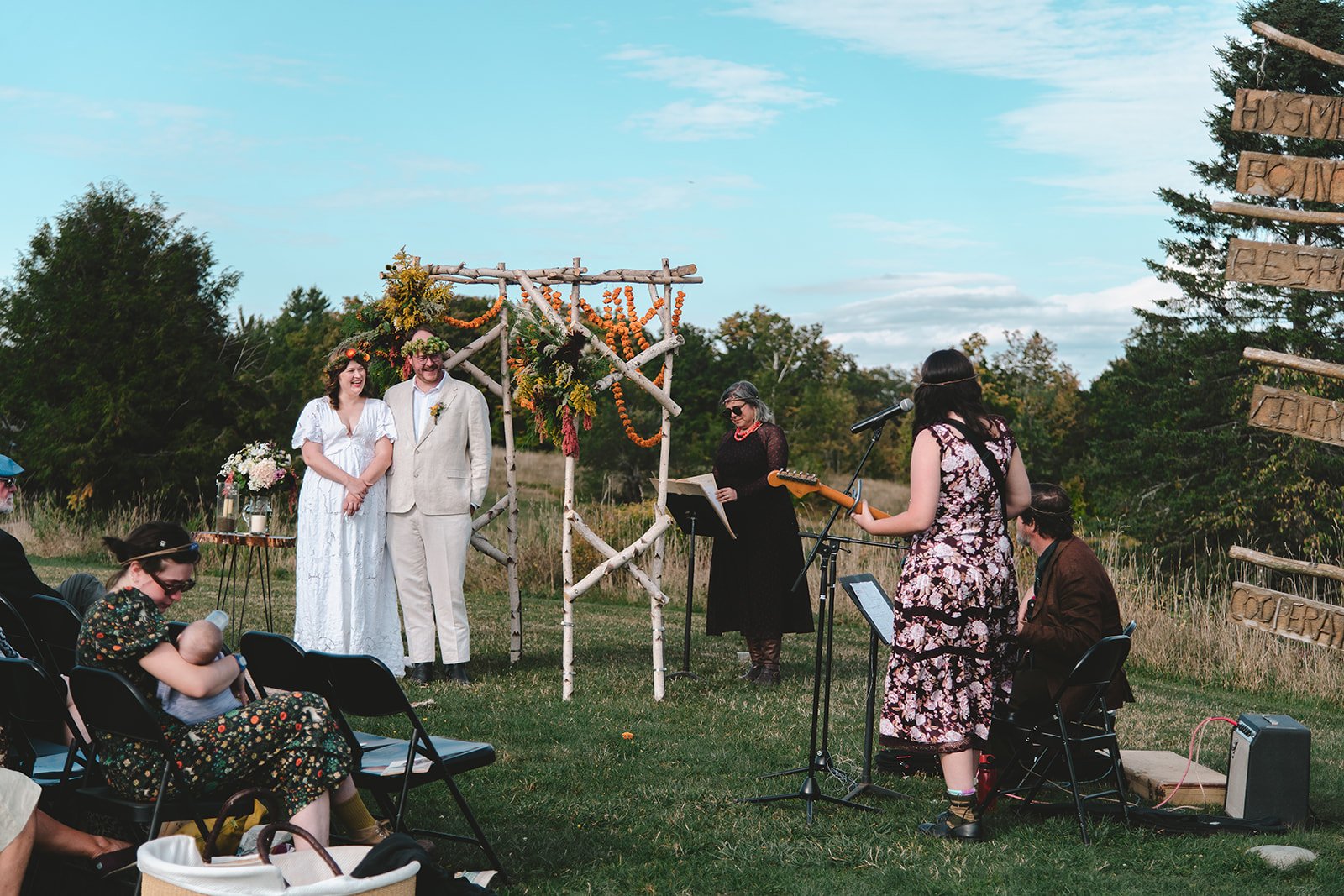 Guests sat wearing flower crowns as gentle clouds drifted through. Becca’s aunt officiated, as she has for many other relatives in their family. Her cousin and uncle sang as she walked down the aisle. During the ceremony, Andrew and Becca wrote their names in a family ledger of marriages dating back decades and lit a candle that had been passed through generations. Their vows were some of the most thoughtful and genuinely funny I’ve ever heard. They were each deeply personal, beautifully written, absolutely hilarious.