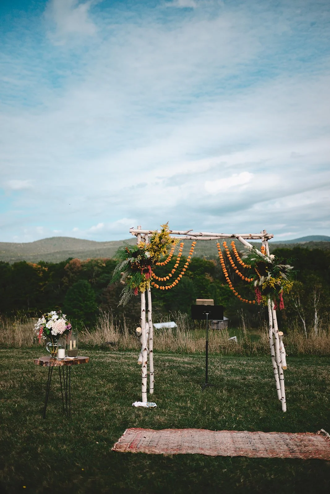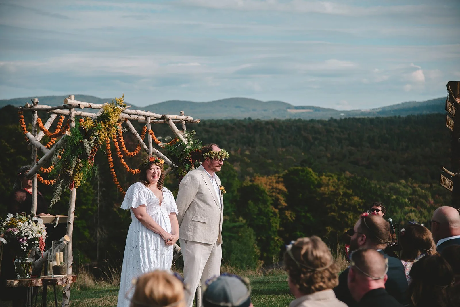 September (or any month) in the Northeast Kingdom is absolutely magical. On this early fall weekend, the leaves had just begun to turn, showing hints of gold and rust against deep green but not yet fully aflame. It was warmer than expected that afternoon, especially for a ceremony on a hilltop with no shade, just open sky and panoramic views of rolling hills and forests.