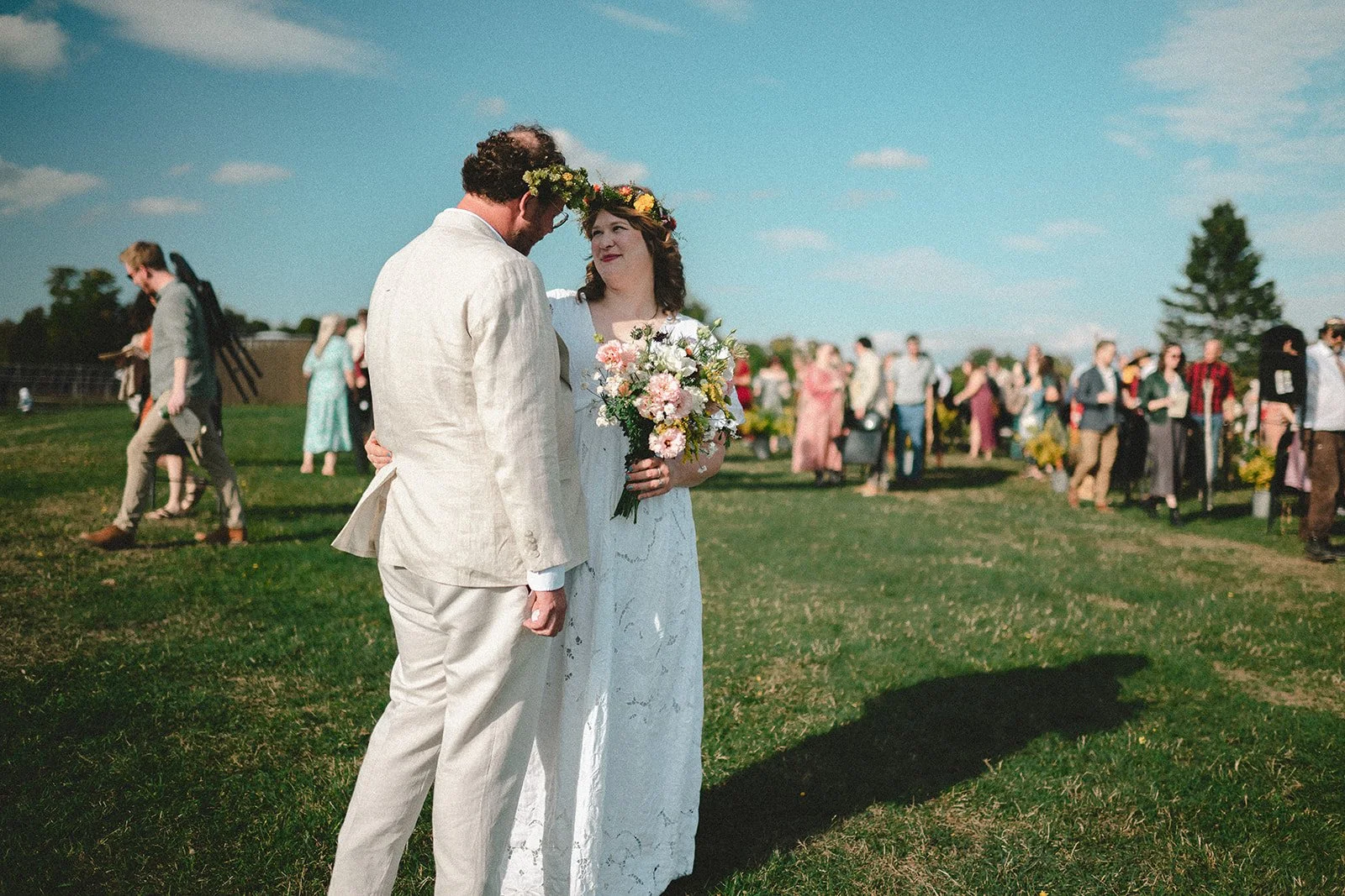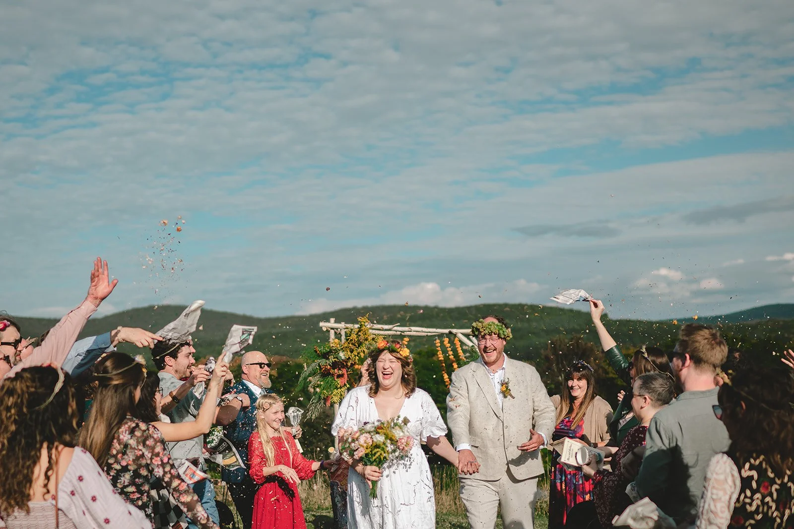 When they walked back down the hill, flower crowns tilted in the sun and confetti flying through the air, it felt less like a wedding exit and more like a homecoming. The kind of moment where everyone is laughing and yelling and you can feel how many hands built the day that just happened.