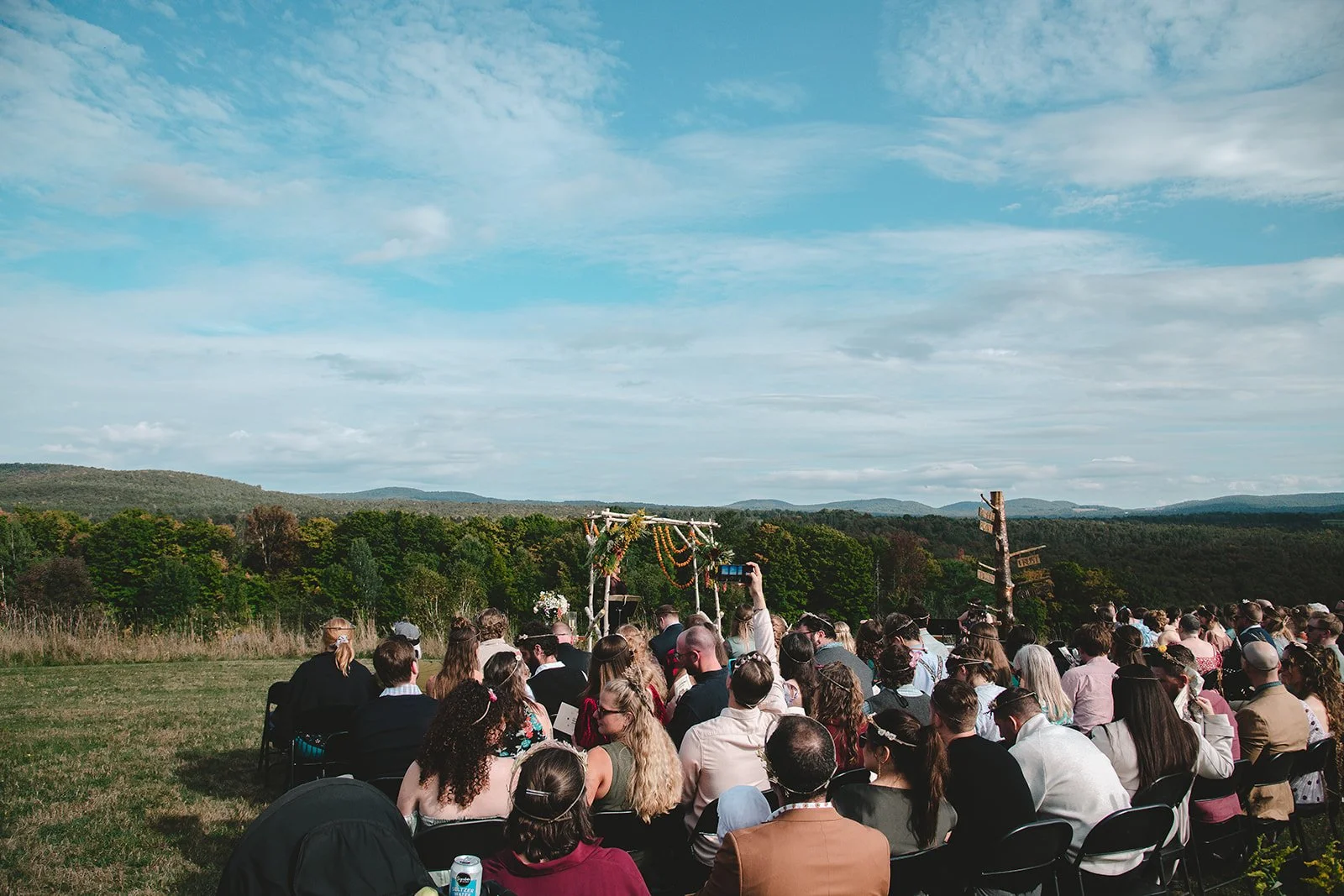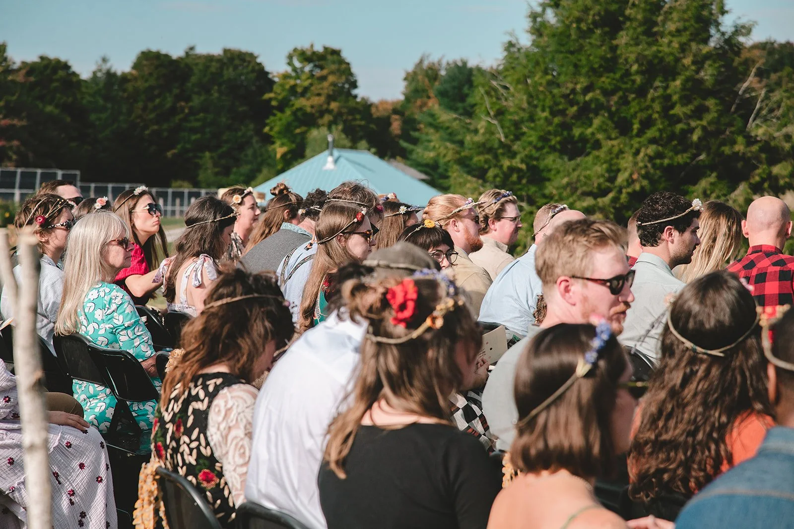 Flower crown-adorned guests awaiting their friends to walk up the hill and down the aisle